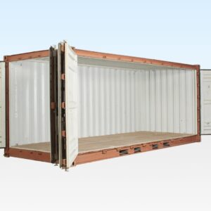 Contentor 20 pés open side usado, com acesso lateral total e portas duplas, ideal para armazenamento e logística.